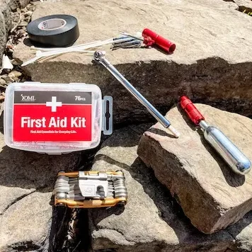 FOR UNEXPECTED FLATS ON THE TRAIL: We rent an ER KIT for $15 (for your entire booking) that includes “bacon strips’ with an injector and a CO2 cartridge to fill up your tire after you plug it. The ER Kit also includes: spare tube, chain link, Pedro tire levers, first aid kit, zip ties, electric tape, tire pressure gauge, and multi tool.
